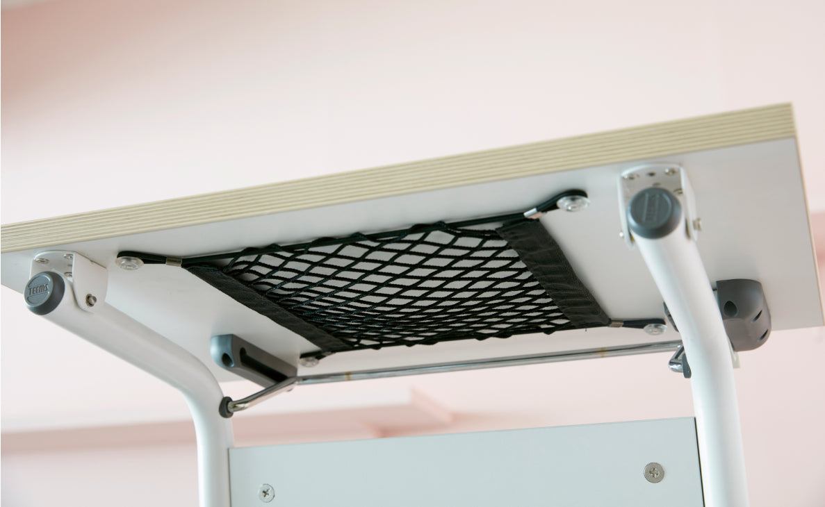 附著於桌板下方的收納網,可用來收納筆電電線、